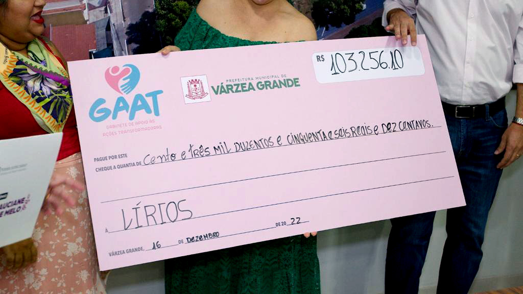 O prefeito de Várzea Grande Kalil Baracat e a primeira-dama e idealizadora do Gabinete de Apoio às Ações Transformadoras (GAAT), promotora de Justiça, Kika Dorilêo Baracat, entregaram para a diretora executiva da Lírios – Liga de Reestruturação das Irmãs Ofendidas no Seu Sentimento, Maria Fernanda Figueiredo, um cheque simbólico no valor de R$ 103.256,10 relativo à arrecadação da Segunda Edição do Bazar do Bem, realizado nos dias 30 de novembro e 1º de dezembro, com a venda de mais de 6 mil peças de roupas, calçados e acessórios. A solenidade de entrega ocorreu no gabinete do Executivo municipal.
